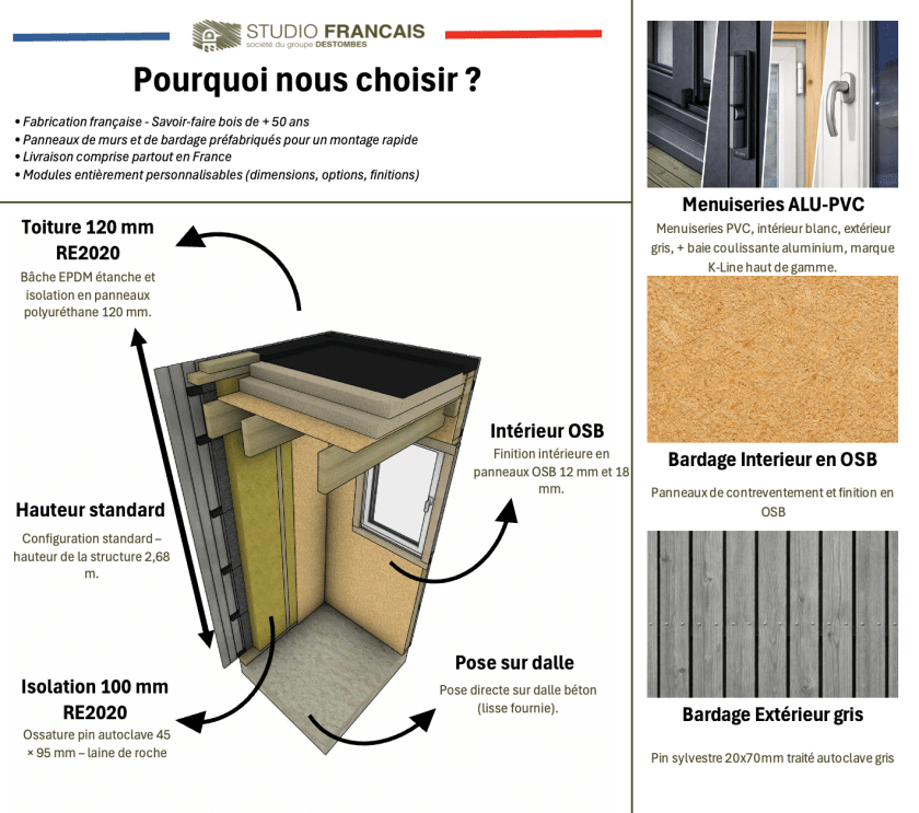 Fabriqué en France par Studio Français, il bénéficie d’une conception durable en ossature bois, avec une fabrication à la commande et un haut niveau de qualité.